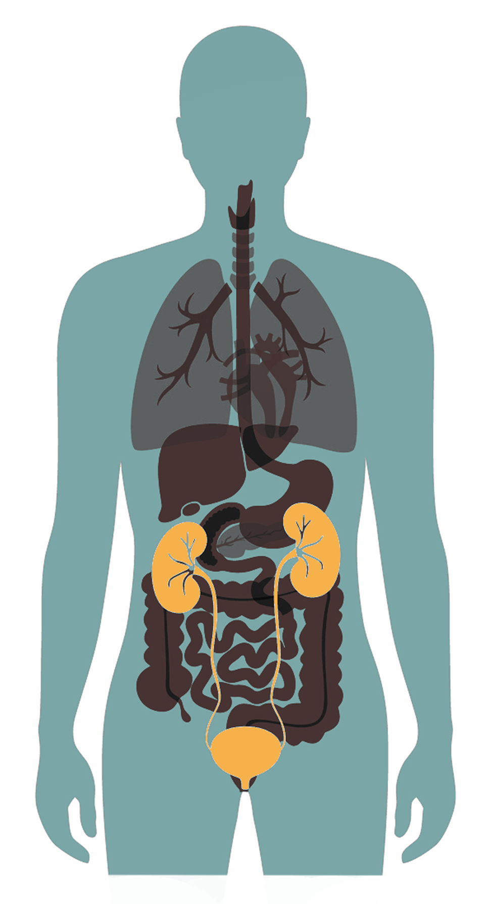 Nyresten: Hvis stoffer eller salte i urinen ikke kan opløses helt, kan de i stedet samle sig til små sten. Stenene kan sidde fast i nyrerne eller urinlederne og give stærke smerter, indtil stenen passerer videre gennem urinvejene.