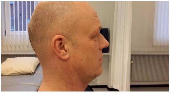 Træk hagen lige ind til halsen, og pres hovedet lige bag ud uden at løfte hagen. Hold gerne en hånd op foran ansigtet og fokusér på den under øvelsen. Det hjælper dig til at undgå at løfte hagen. Fortsæt øvelsen 10 gange. Ved de sidste gentagelser kan du med fordel presse hagen let bagud med hånden.