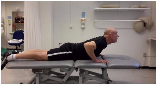 Læg dig på maven. Pacer hænderne under skuldrene, og stræk armene, uden at hofterne løftes fra underlaget. Bøj hovedet bagover, så hele rygsøjlen bliver bøjet bagover i et svaj. Hold positionen i 2-5 sekunder.