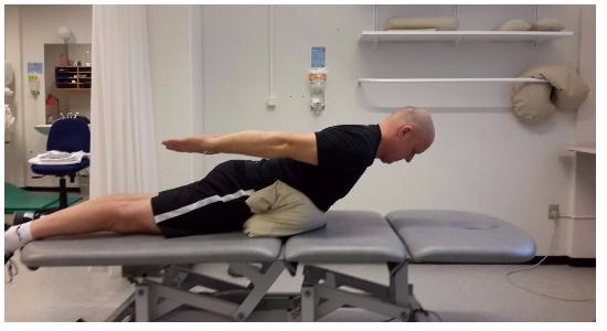 Læg dig på maven ind over et stort sammenrullet tæppe eller lignende. Løft overkroppen op, mens du løfter armene op bagud og trækker skulderbladene sammen. Hold positionen i 2-5 sekunder.