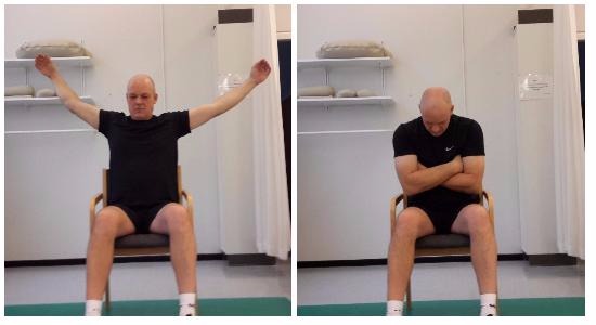 Sæt dig på en stol. Træk vejret dybt ind, og løft brystkassen, mens du fører armene skråt op og ud til siden. Pust ud, mens du krummer dig sammen og klemmer brystkassen sammen med arme og hænder. Træk vejret dybt ind, og gentag øvelsen.